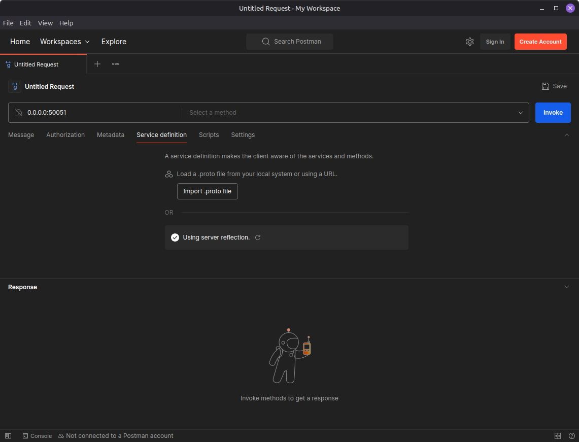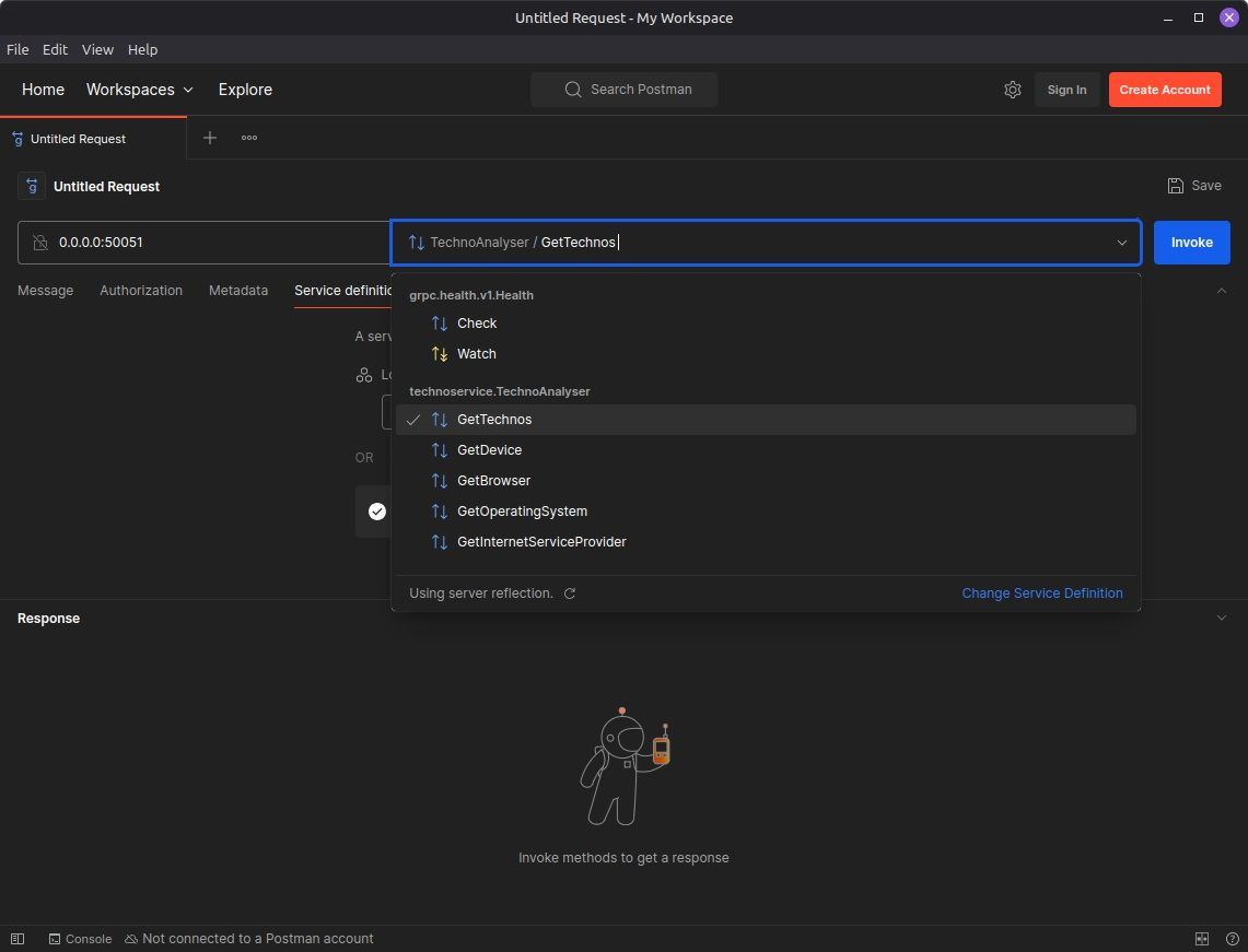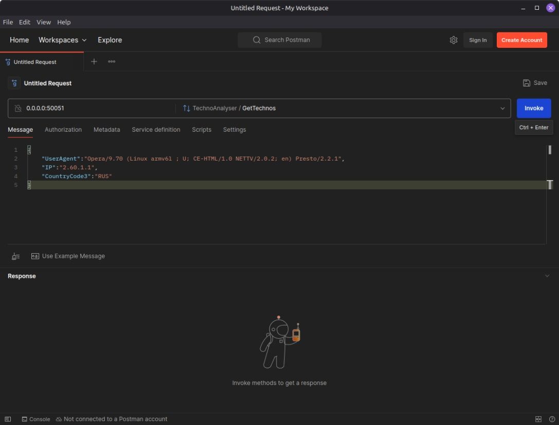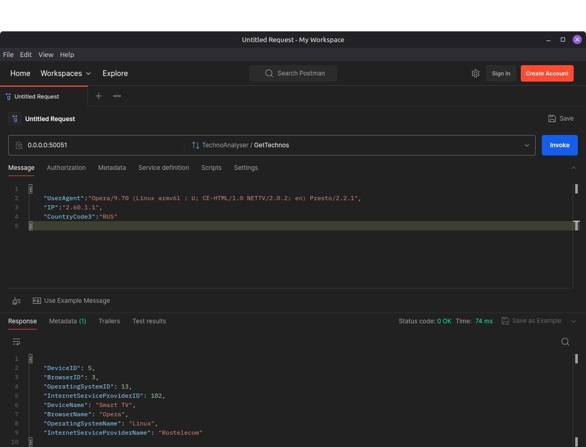 Например, при использовании консольной grpcurl, должна сработать такая команда: $ grpcurl -plaintext -d '{"UserAgent":"Opera/9.70 (Linux armv6l ; U; CE-HTML/1.0 NETTV/2.0.2; en) Presto/2.2.1","IP":"2.60.1.1","CountryCode3":"RUS"}' 0.0.0.0:50051 technoservice.TechnoAnalyser.GetTechnos